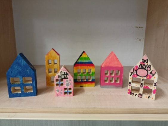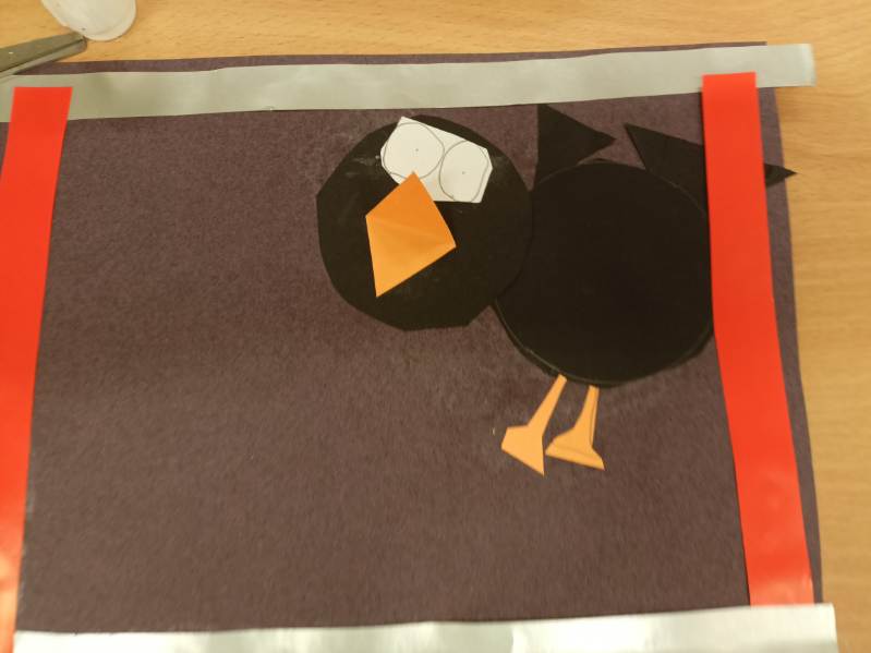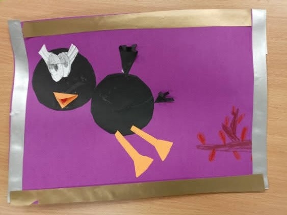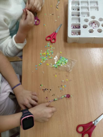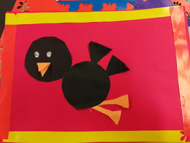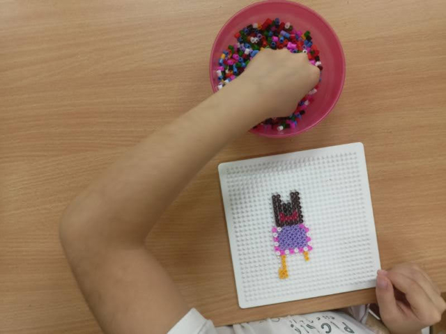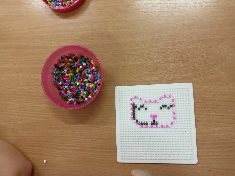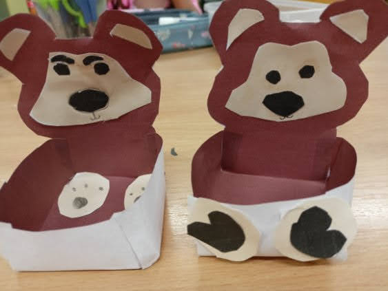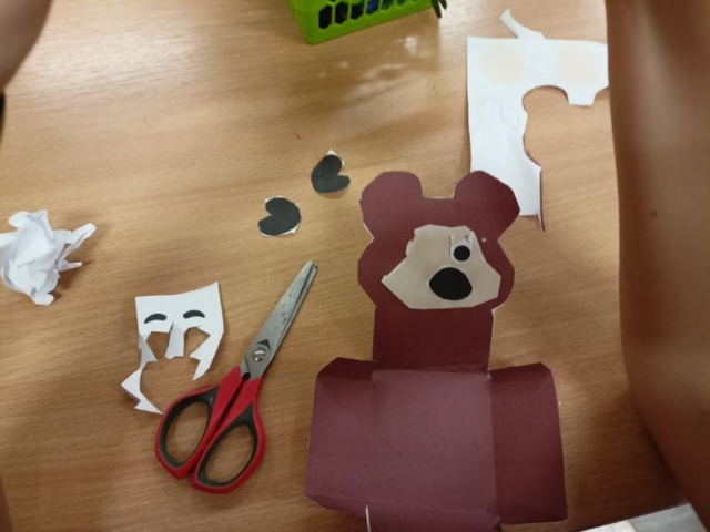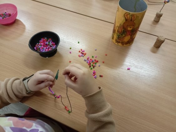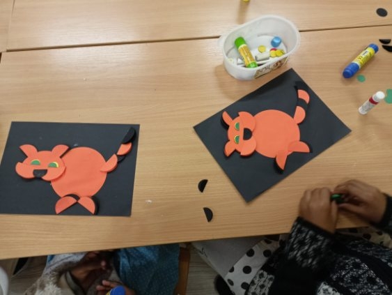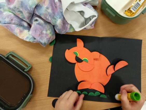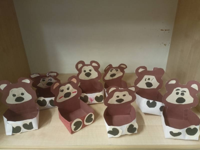Prezentowane prace powstały podczas zajęć: „Kreatywne popołudnia” – tym razem były to prasowanki z koralików, „Sztuczki” – jesienne drzewa malowane za pomocą patyczków higienicznych oraz kolorowe parasolki. Natomiast misie i kruki to dzieła uczestników „Origami i inne zabawy z papierem”.