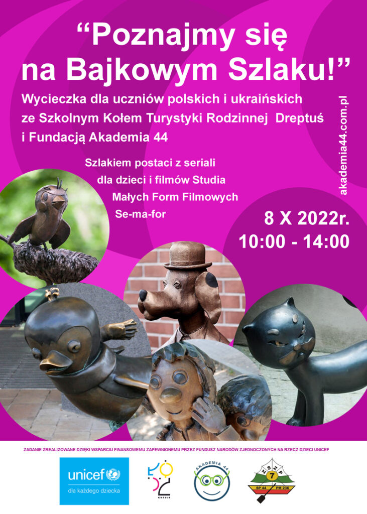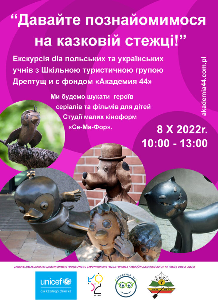 Już w najbliższą sobotę, 08.10.2022r. Szkolne Koło Turystyki Rodzinnej Dreptuś oraz Fundacja Akademia 44 wyruszą na wycieczkę integracyjną dla społeczności polskiej i ukraińskiej „Poznajmy się na bajkowym szlaku”